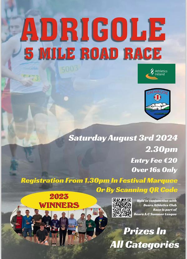 Adrigole will again be the location for a 5 mile road race, that will be held on the bank holiday Saturday, August 3rd at 2.30pm. The race will be held in conjunction with Beara AC and there will be prizes in different categories. The race will be open to those who are over 16 only and there will be a €20 charge to enter, with registration taking place at https://eventmaster.ie/event/vB28cPoSb4 or in the festival marquee from 1.30pm. The race will be held in conjunction with Beara Athletics Club and there will be prizes in different categories. The race will form part of the Beara Athletic Club Summer league series that will take place over July and August, with races held in Bere Island, Eyeries, Adrigole and Glengarriff.