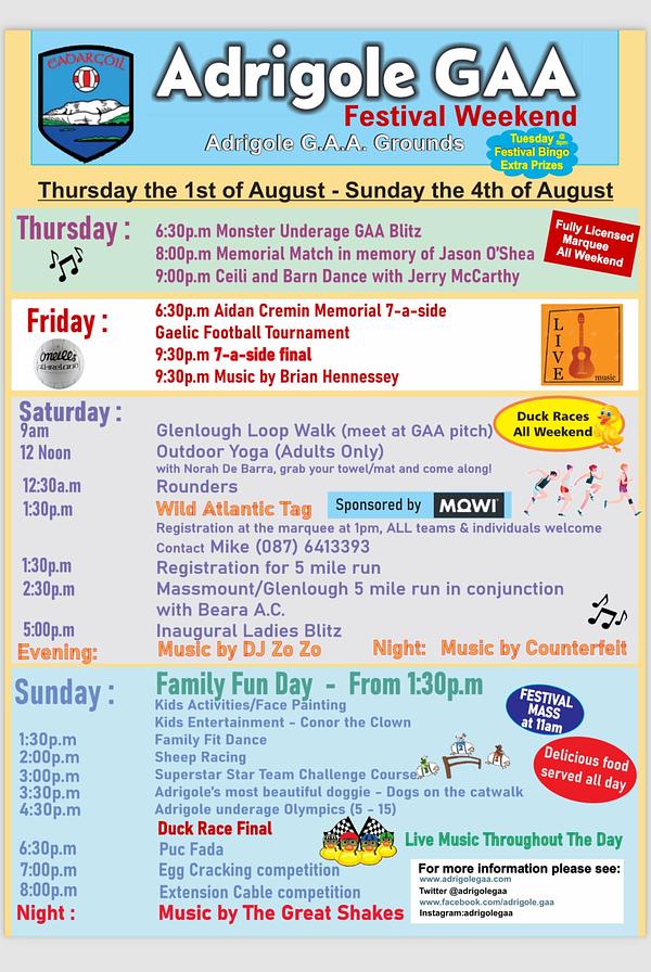 We are delighted to welcome everyone to the Adrigole GAA Festival Weekend